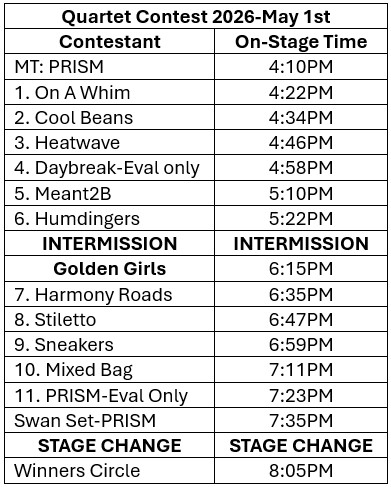 On-stage times for Choruses and Quartets